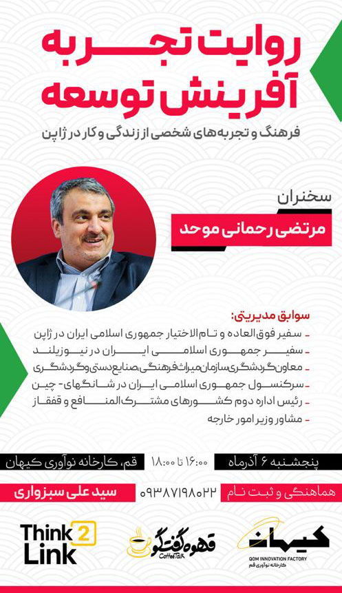 نشست «روایت تجربه، آفرینش توسعه» با سخنرانی جناب آقای مرتضی رحمانی موحد (مشاور وزیر امورخارجه، سفیر سابق ایران در ژاپن و معاون گردشگری سازمان گردشگری و میراث فرهنگی) روز پنج شنبه 6 آذرماه ساعت 16 الی 18 برگزار خواهد شد.