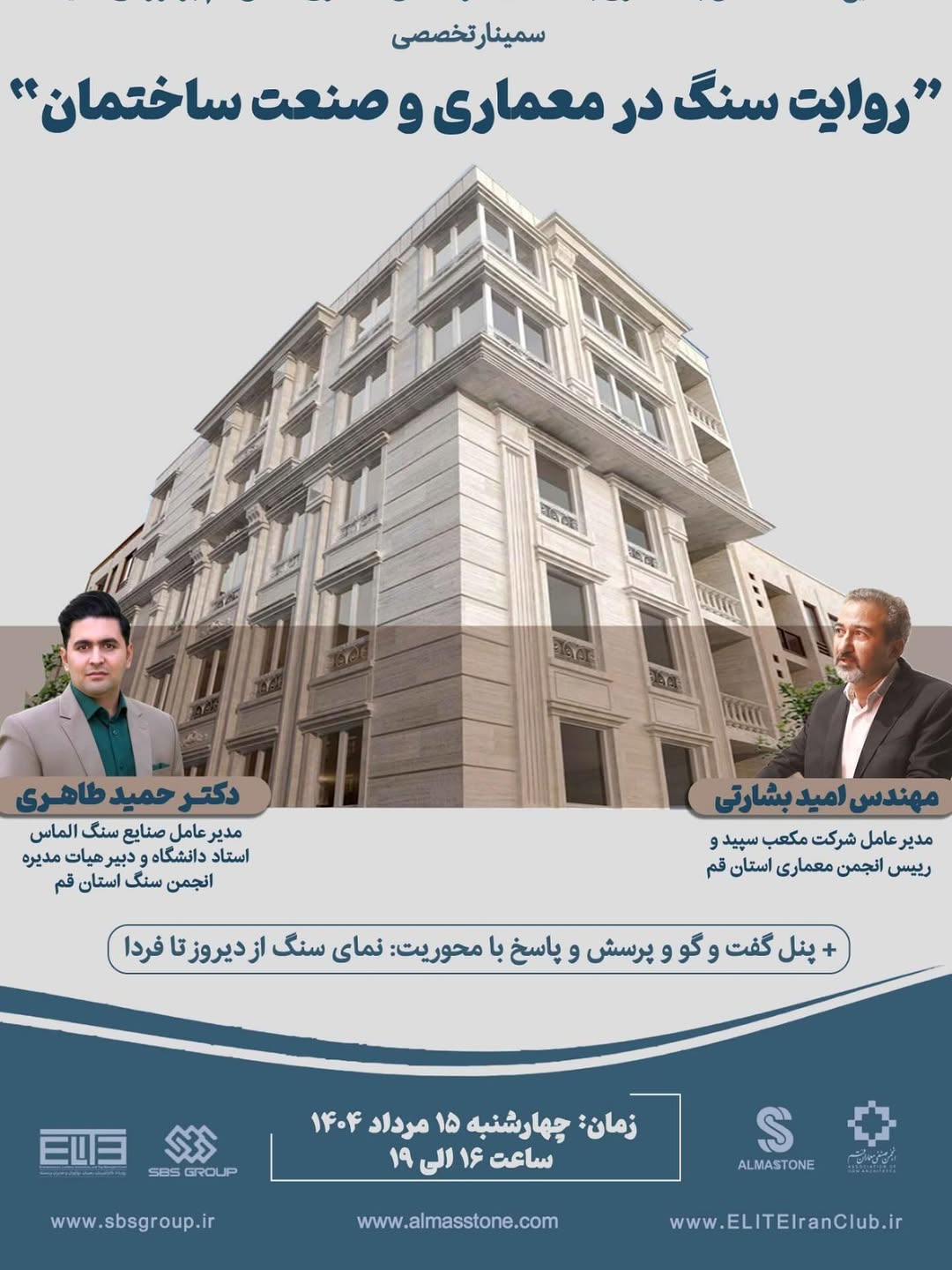 اين نشست به همت باشگاه اليت SBS و صنايع سنگ الماس و با حمايت انجمن صنفى معماران در روز چهارشنبه، ١٥ مردادماه ١٤٠٤ برگزار شد.در اين نشست كه آقايان مهندس بشارتى (مديرعامل شركت مكعب سپيد و رييس انجمن معماران) و دكتر طاهرى (مديرعامل صنايع سنگ الماس و دبير انجمن سنگ) برگزار شد، درباره موضوعات مختلف مرتبط با سنگ و تاريخچه و كاربرد آن در معمارى و صنعت ساختمان گفتگو و تبادل نظر شد.